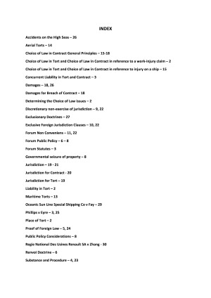 All topics for elective LPAB 18 Conflict of Laws subject covered comprehensively. Topics covered are: Accidents on the High Seas Aerial Torts Choice of Law Choice of Law in Tort and Choice of Law in Contract in reference to a work-injury claim Choice of Law in Tort and Choice of Law in Contract in reference to injury on a ship Concurrent Liability in Tort and Contract Damages Discretionary non-exercise of jurisdiction Exclusionary Doctrines Exclusive Foreign Jurisdiction Clauses Forum Non Conveniens Forum Public Policy Governmental seizure of property Jurisdiction Liability in Tort and Contract Maritime Torts Phillips v Eyre Place of Tort Proof of Foreign Law Public Policy Considerations Renvoi Doctrine Substance and Procedure