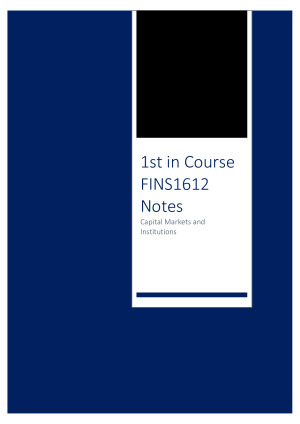 1st in course comprehensive and detailed FINS1612 notes (HD mark of 97). It covers all weeks, relevant Viney textbook chapters, examples, tutorials and lecture content - including the CFA ethics module notes. Topics Covered: - Introduction to Financial Markets and Banking - Debt: Simple Interest and Short-Term Debt - Debt: Compound Interest and Long-Term Debt - Equity: The Corporation and Capital Markets - Equity: Investing in Markets and Market Efficiency - CFA Ethics - The Foreign Exchange Market - Risk Management and Derivatives - Introduction to Options *Please note that images were taken out due to StudentVIP's copyright and IP policy.
