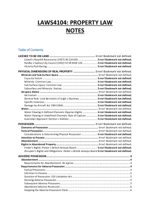 Property Law notes used in LAWS4104 at the University of Western Australia. Course covers all aspects of property law and foundational property law concepts, focussing on the transfer and creation of interests in real and personal property. Overall Mark: 79% Topics Covered - Licence to be on Land - Physical Dimensions of Real Property (Minerals, Airspace, Water) - Possession (Finder's Rights, Occupier's Rights) - Abandonment - Adverse Possession - Fixtures - Acquisition and Transfer of Interests of Land - Formalities for Transfers of Legal Interests in Land - Creation of Interests in Equity - Priority Disputes Regarding Legal/Equitable Interests - Co-Ownership (Joint Tenancy, Tenancy in Common)