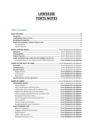 Torts notes used in LAWS4106 at the University of Western Australia. Course focusses centrally on negligence while also touching on intentional torts. Comprehensive notes package including all required readings along with relevant case summaries. Overall Mark: 84% Topics Covered (Negligence) Duty of Care - Duty of Care for Public Bodies - Scope of the Duty of Care - Differing types of Harm (Psychiatric Injury & Pure Economic Loss) Standard of Care Required - Standard of Care Generally - Standard of Care for Medical and Other Professionals - Occupier's Liability Breach of Duty of Care Causation - Causation Generally - Factual Causation - Scope of Liability Defences - Contributory Negligence - Volenti (Common Law & Under Statute) - Illegality Third Party Liability - Vicarious Liability for Employers - Failure to Control - Non-Delegable Duties Topics Covered (Intentional Torts) - Battery - Assault - False Imprisonment - Trespass to Land - Defences to Intentional Torts