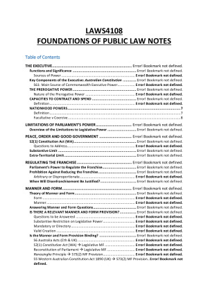 Comprehensive exam-style notes for LAWS4108 at the University of Western Australia. Course focusses on foundational public law concepts regarding the powers and limitations on the executive, judicial and legislative arms of government. Includes detailed case summaries on each legal topic. Score: 79 Topics Covered The Executive - Functions and significance - Prerogative powers - Capacities to contract and spend - Nationhood powers Limitations on Legislative Power - Disenfranchisement - Manner and form - Peace, order and good government The Judiciary - Federal judicial power, the Boilermakers' Principle - Exceptions to Boilermakers - State judicial power, the Kable Principle - Judicial Review The "Integrity Branch" - Administrative Tribunals - FOI Legislation - The Ombudsman Topics NOT Covered - Constitutional reform - Qualifications of electors