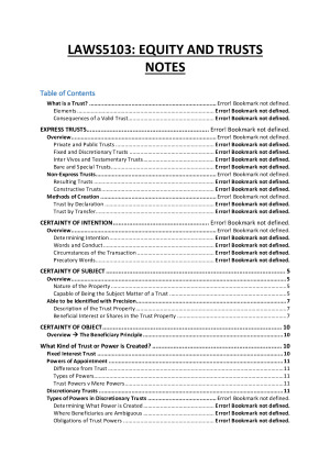 Equity and Trusts notes used in LAWS5103 at the University of Western Australia. Courses focusses on fundamental equitable concepts, the fundamentals of trust law and fiduciary duties. Note --> notes are adapted for examination purposes, and do NOT include the "Equity" component of the unit. Overall Mark: 76% Topics Covered Nature of Express Trusts - Fixed and discretionary trusts - Methods of creation The Three Certainties - Certainty of Subject - Certainty of Intention - Certainty of Object Trusts for Charitable Purposes Trusts for Anomalous Purposes Complete Constitution of Trust Duties of Trustees - Breach of Trustee's Duties - Remedies for Breach Fiduciary Duties - Existence of fiduciary relationship - Scope of fiduciary duty - Breach of duties (Conflict and Profit Rules) - Defences to breach - Remedies to breach