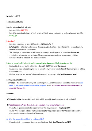 Homicide Unlawful killing – s277 Murder – s279 1. Intentional Murder 2. Dangerous Act Murder Manslaughter – s280 Unlawful assault causing death – s281 Non-Fatal, Non-Sexual Offences Simple Assault – s222, s223, s313 Assault occasioning bodily harm – s317 Serious Assault – s318 Grievous Bodily Harm – s297 Wounding / poisoning – s301 Wounding or GBH with intent – s294 Threats – s338 Stalking – s338E Circumstances of aggravation – s221 Sexual Offences Indecent Assault – s323 Sexual Penetration Without Consent – s325 (b) Without consent Sexual Coercion – s327 Property Offences Stealing – s378 Robbery – s392 Other forms of robbery s392(c) – Armed robbery s392(d) – Robbery in circumstances of aggravation Assault with intent to rob – s393 Burglary – s401 Fraud – s409 Damage to Property Attempts, conspiracies & parties Attempts Conspiracies Parties Defences Unwilled acts – s23A Accident – s23B Insanity – s27 Intoxication – s28 Self-defence – s248 Provocation – s246 (e) Force not disproportionate to the provocation Honest Claim of Right – s22 Mistake of fact – s24