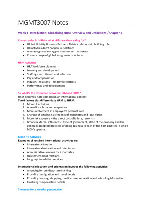 High quality, detailed notes for MGMT3007 (International Human Resource Management). Topics covered include: Week 1 – Introduction: Globalising HRM: Overview and Definitions Week 2 – The Cultural Context of IHRM Week 3 – The Organisational Context of IHRM Week 4 – Sourcing HR for Global Markets: Recruitment and Selection Week 5 – Performance Management Week 6 – Learning and Development Week 7 – Compensation: Global Pay week 8 – Industrial Relations in a Global Context Week 9 – Global Careers and Talent Management Week 10 – Managing Diversity and Inclusion Week 11- IHRM Trends and Future Challenges Week 12 – IHRM Case Studies: Global Mobility I achieved a Distinction in this unit.
