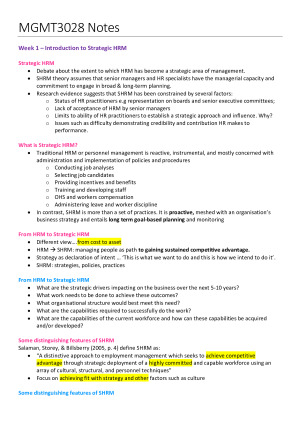 High Distinction MGMT3028 (Strategic HRM) Notes. Topics covered: Week 1 – Introduction to SHRM Week 2 – Formulation of HRM Strategy Week 3 – SHRM: Best Fit and Best Practice Week 4 – SHRM: The RBV Week 5 – Strategic role of HR Week 6 – No Lecture Week 7 – Building a Workforce Week 8 – Performance and Rewards