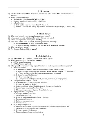 Notes of eight parts, utilised for online exam but drafted to be suitable for in-person exams. (I) Roadmap of broader issues identifying key cases (see sample notes); (II) Merits review comprising SACAT only (not AAT); (III) Preliminary matters to judicial review including fact/law distinctions and jurisdiction; (IV) Grounds of judicial review including (see sample notes for detailed grounds): a. Procedural fairness; b. Acting beyond the scope of a power; c. Improper exercise of a power; (V) Delegated legislation and grounds of review; (VI) Jurisdictional error at common law; (VII) Remedies; and (VIII) Relevant legislative extracts from the ADJR and SACAT Acts.