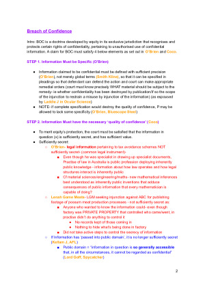Comprehensive Equity exam notes which enabled me to attain a 93 overall in Equity. Exam Notes Cover Topics: - Breach of Confidence - Breach of Fiduciary Duty - Third Party Liability, Knowing Receipt, Knowing Assistance - Personal Remedies in Equity (including Specific Performance, Injunction and Specific Delivery, Injunction and Delivery Up of Chattels, Injunction and Exclusive Service Contracts, Declarations, Equitable Rescissions, Account of Profits, Equitable Compensation, and Lord Cairns Act Damages) - Equitable Proprietary Remedies (including Constructive Trusts and Equitable Liens) - Tracing - Assignment of Property Rights in Equity (including for Torrens Land/Shares/Chose in Action, Property Rights Recognised only in Equity, and Voluntary Assignment of Future Property (with and without consideration). Notes additionally include an extra remedies summary at bottom of document which I used to ensure I did not miss any steps when assessing which remedy was most appropriate. All notes in document are organised by topic, with relevant cases (including facts) sorted below each principle the case relates to. Each topic is separated into numerous steps ( step 1, 2, , , 3, etc) to enable structured exam response. Good luck for Equity! It's a great unit!