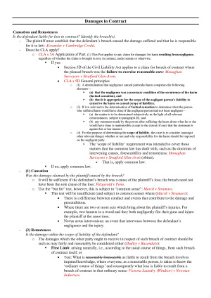 LAWS1017 TORTS AND CONTRACTS II NOTES EXAM HD Comprehensive notes for the entire subject formatted in a scaffold. Covers all topics assessed: 1. Introduction: Tort and Contract 2. Causation and Remoteness of Damage in Contract 3. Measure of Damages in Contract and Sums Fixed by Contract 4. Introduction to Vitiating Factors and the Remedy of Rescission 5. Mistake and Duress 6. Undue Influence, Unconscionable Conduct and Unfair Contract Terms 7. Misrepresentation at Common Law and Statutory Liability for Misleading or Deceptive Conduct 8. The Tort of Trespass to Land 9. The Tort of Private Nuisance 10. Tort Liability for Interference with Goods 11. Liability in Tort for Purely Economic Loss I: Negligent Misstatements and Professional Negligence 12. Liability in Negligence for Purely Economic Loss II: Loss from Damage to Third Party Property or Third Party Injury 13. Liability in Negligence for Purely Economic Loss III: Duties of Care for Pure Economic Loss from Defective Structures and Products 14. Multiple Wrongdoers: Proportionate Liability for Certain Property Damage and Economic Loss and for Statutory Liability for Misleading or Deceptive Conduct