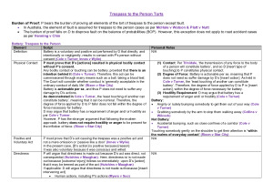 Up to date note (Semester 2, 2021) Topics include: 1 Trespass to the Person 2. Defences to Trespass to the Person 3. Trespass to Land & Private Nuisance 4. Negligence: Duty of Care (General) 5. Negligence: Special Duty Situations (Pure Mental Harm and Pure Economic Loss) 6. Negligence: Breach of Duty 7. Negligence: Causation 8. Negligence: Remoteness 9. Defences to Negligence 10. Damages and Vicarious Liability