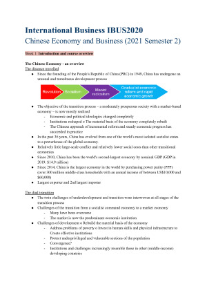 Detailed notes for IBUS2020, including Chinese terminologies which are essential for the final exam! Topics covered: Week 1: Introduction and course overview Week 2: History 1: From opium war to the socialist era, Week 3 History 2: Transition from the planned economy to the market economy Week 4: Framework I: Legacies and business culture in China Week 5: Framework II: Analyzing China's business environment Week 6: China and global business 1: Entering China Week 7: China and global business 2: Partnering with China Week 8: China and global business 3: Localizing and globalizing with China Week 9: China and global business 4: Domestic companies in China (SOE & POE) Week 10: China and global business 5: Chinese firms' global expansion Week 11: Special topics: The business between China to Australia