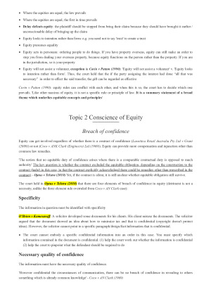 This note is organised in a logical way and is especially helpful to answer the problem questions. Key cases are highlighted and their facts are also provided in this note. It helps me get Distinction in Equity. It includes the following: 1. History and Nature of Equity Introduction Judicature Act and Fusion Fallacy Maximum of Equity 2. Conscience of Equity: Breach of confidence Estoppel 3. Remedial Equity Specific Performance Injunction Damages under Lord Cairn’s Act 4. Trust Nature and Constitution of Trust Beneficiary Principle Express Trust Fiduciary Obligation Resulting Trust Constructive Trust 5. Tracing Mixtures 6. Charity Charitable heads Public benefit Schemes ......