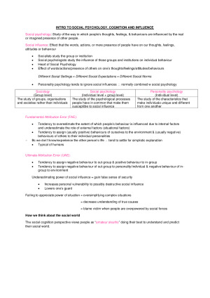 Detailed and concise notes to help you through the course of psy2042. Since there's a lot of content for this unit, the notes are specified to only what you need to know most for the end of year exam and assessments. I hope they are useful :) Contents Social cognition and social influence Social identity and social attribution Group dynamics and intergroup behaviour (relations and conflicts) Prejudice, discrimination, and prosocial behaviour Attitudes and attitude change Attraction and Aggression Introduction to Personality Theory and Psychodynamic Theory Trait Theory Learning Theories Self-Concept and Self-Processes Biological Theories Culture and Personality
