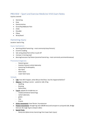 Week 1-12 info from Lectures + Tutorials to help with studying for the VIVA practical Exam. Split into body part injuries ie. Hamstring, Knee, shoulder, calf etc. - injury mechanism - provisional diagnosis - TOTAPS - special tests (names, what they test for, instructions on how to do them) - Manual Muscle Testing (MMT) - youtube link, position, grade 0-5, explanation of how to do it - prehab/injury prevention exercises - taping - function, dot point instructions on how to do it.