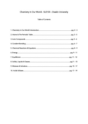 SLE133 Chemistry In Our World - Complete Unit Notes (HD) Includes Notes from Each Week of Lectures to Cover the Entire Unit Included Pictures/Diagrams Taken From Lecture Notes to Aid in Explaining Topics. I Recently Graduated My Bachelor of Biomedical Science at Deakin University with Distinction Using These Notes. 1. Chemistry in Our World Introduction 2. Atoms & The Periodic Table. 3. Ionic Compounds 4. Covalent Bonding 5. Chemical Reactions & Equations 6. Energy 7. Equilibrium 8. Solids, Liquids & Gasses 9. Mixtures & Solutions 10. Acids & Bases Perfect To Complement Your Own Notes or As an Exam Revision Tool