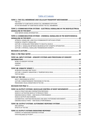 Neuroscience of communication, sensory and control systems notes cover: - Topic 1: Cells and Cell Membranes - Topic 2: Communication Systems- Electrical Signalling - Topic 3: Communication Systems - Chemical Signalling - Topic 4: Cell Signalling: Input, Somatic and CNS - Topic 5: Output systems: Muscles, Endocrine and Autonomic Control These notes are detailed and comprehensive lecture summaries of all lectures, tutorials and some pre-prac notes. All the information needed for the exams and assessment is within this 169 page document. It contains a glossary with all the topics and individual lectures along with sample practice questions to help you get a HD.