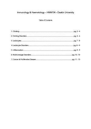 HMM104 Immunology & Haematology - Deakin University - Complete Unit Notes Includes Notes from Each Week of Lectures to Cover the Entire Unit Included Pictures/Diagrams Taken From Lecture Notes to Aid in Explaining Topics. I Recently Graduated My Bachelor of Biomedical Science at Deakin University with Distinction Using These Notes. 1. Clotting 2. Clotting Disorders 3. Leukocytes 4. Leukocyte Disorders 5. Inflammation 6. Multi-Lineage Disorders 7. Cancer & Proliferative Disease Perfect To Complement Your Own Notes or As an Exam Revision Tool