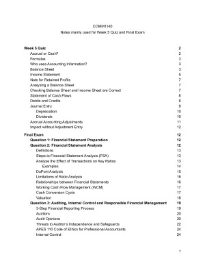 Concise, but comprehensive summary notes used to take the Quiz and Final Exam. - Formatted specifically to be able to take exams with no stress - Includes some possible exam questions and responses - Featuring only the most necessary information to reinforce concepts Topics Covered Include: Week 1 - Introduction to Financial Management Week 2 - Measuring Financial Performance and Financial Position Week 3 - Recording Business Transaction: Journal Entries Week 4 - Recording Business transactions: Adjusting Entries Week 5 - Auditing and Internal Control Week 7- Financial Statement Analysis Week 8 - Cash Flow Management and Valuation Week 9 - Free Cash Flow Estimation Week 10 - Responsible Financial Management I created this cheatsheet to receive a high distinction mark in this course. It was the first time that I wasn't stressed during my exams because I had these notes with me! Use this cheatsheet for both preparing for your exams while doing practice questions and during the exam to ensure that you can remember the key concepts and also exceptions to the rule in trick questions they may throw at you.