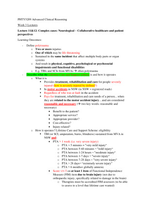 - Lecture contents covered for Final MCQ Examination: Week 1: Introduction to PHTY5209 Advanced Clinical Reasoning; Evidence‐based practice I: Qualitative research for Physiotherapists 2021; Evidence‐based practice I: Critically Appraising Qualitative research; Evidence-based practice II: Appraising qualitative Systematic reviews; How to use the Physiotherapy Evidence Database (PEDro) to find evidence about therapy Week 2: Evidence-based practice II: Effects of therapy – individual studies; Evidence-based practice II: Evaluating and interpreting systematic reviews of therapy effects; Complex case – Chronic pain master class Week 3: Complex cases: Neurological – Collaborative healthcare and patient perspectives; Peripheral neuropathy Week 4: Complex Case Master Class 4 – MSK; Rehabilitation and Exercise after Treatment for Cancer: a role for physiotherapists Week 5: Professional ethics within healthcare – Clinical and Ethical Dilemmas 1-3 - The relevant lecture slides are summarized in the notes in addition to self-researches in accordance to the learning objectives which are exam-specific - Case study and evidence study are also analyzed and summarized with relevant descriptions, interpretations and implications - There are personal insights at the end of each week's topics to emphasize the important concepts of those lectures to prepare for exam effectively - The notes are comprehensively made combined with diagrams and words in point-form highlighted in different colours help you achieve an HD!