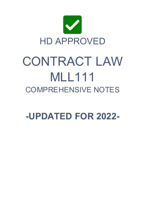 I worked hard to produce these notes of the course of a trimester, they are exceptionally detailed and will give you everything you need to nail MLL111 Contract. I really hope you get as much out of reading these as I got out of writing them. These notes cover the following topics: - Formation of Contracts > Agreement > Offer > Acceptance > Certainty > Consideration > Intention > Capacity > Formalities - Scope and Content of Contracts > Privity of Contract > Express Terms > Implied Terms > Construction of Terms > Exclusion Clauses - Avoidance > Avoidance by Consumer Law > Mistake > Abuse of Dominant Position > Illegality - Performance and Termination > Discharge by Performance > Discharge by Agreement > Discharge by Breach > Discharge by Frustration - Remedies > Common Law Remedies > Equitable Remedies