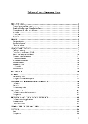 A set of summary notes that is perfect for use in exam context. The notes condense all the content of the course, including important case law, legislation and academic opinions. Additionally, legislative provisions and case names are colour coded for clarity and ease of use in time pressured exam environments. Topics covered: - Introduction to Evidence Law - Proof I (Burdens and Standards) - Adducing Evidence (Witnesses, Documents and Real Evidence) - Relevance - Hearsay - Admissions and Self-Incrimination - Credibility - Tendency and Coincidence Evidence - Character of the Accused - Opinion Evidence - Identification Evidence - Discretions - Proof II (Directions)