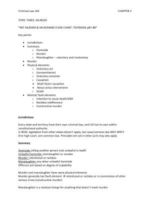 Full set of notes for all weeks of crim law, with case authorities and element summaries for offences (essential for exams): Week one: Introduction to criminal law Week two: Criminal procedure Week three: Murder Week four: Manslaughter Week five: Non fatal offences Week six: Sexual offences Week seven: Defences I Week eight: Defences II Week nine: Property offences Week ten: Drug offences Week eleven: Complicity and attempts