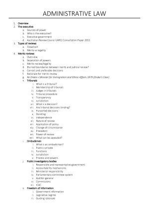 SUPER COMPREHENSIVE Administrative Law Notes to help you nail the final exam! Every topic from lectures and tutorials including: - The executive - Types of reviews - Merits reviews - Tribunals - Ombudsmen - Public Investigatory Bodies - Freedom of Information - Privacy - Delegated Legislation - Judicial Review - Judicial Grounds for Review - Remedies
