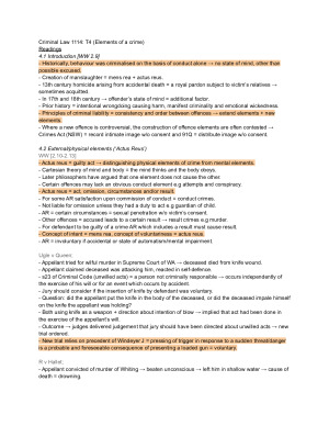 These notes cover all of the assessable topics (topics 4,5,6) for the quiz in LAW 1114 and contain material from every lecture, reading, tutorial, workshop and video. After creating this study guide I was able to receive an 95 (19/20) on the quiz as these notes are straightforward and contain everything one needs to know! Topic 4: Elements of a crime Topic 5: Non-fatal, non-sexual, offences against the person Topic 6: Sexual offences
