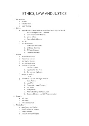 These notes contain all content from lectures, tutorials and extra content to help you navigate the surprisingly complex subject of Ethics, Law and Justice. Topics include: - Ethics - Justice - Access to Justice - Alternative Options for Legal Services - Lawyers - The Judiciary - Uniform Laws - Admission to Practise - Lawyer-Client Relationship - Duties to Clients - Duties to the Profession - Duties to the Court - Duties to Third Parties