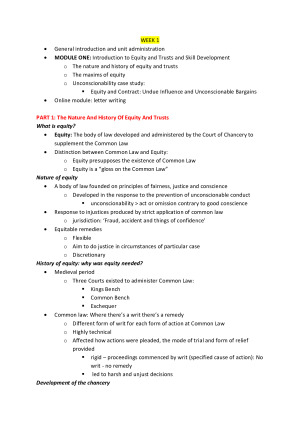 Super extensive notes. These lecture notes cover weeks 1-13; fiduciary, equitable estoppel, equitable remedies, and trusts These notes are incredibly extensive and have an easy to follow structure for exam purposes. This unit can be quite difficult to gain a proper understanding of, so these notes will be super useful. They also include the relevant case law with summaries. Great resource for the exam!