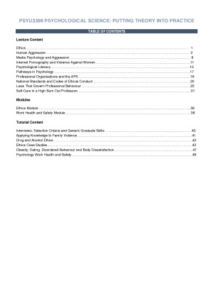 High quality, comprehensive, lecture/tutorial/module notes for PSYU3399. Includes lecture content on - Ethics - Human Aggression - Media Psychology and Aggression - Internet Pornography and Violence Against Women - Psychological Literacy - Professional Organisations and the APS - National Standards and Codes of Ethical Conduct - Laws that Govern Professional Behaviour - Self Care in a High Burnout Profession Includes content on the modules - Ethics - Work Health and Safety Includes Tutorial Content on - Interviews, Selection Criteria and Generic Grad Skills - Applying Knowledge to Family Violence - Drug and Alcohol Ethics - Obesity, Eating, Disordered Behaviour and Body Dissatisfaction - Psychological WHS - Psychological Injury