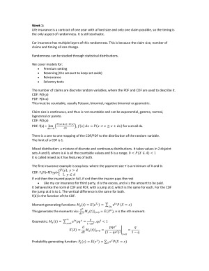 Covers all lectures, tutorials, extra work and relevant Actuarial Institute readings. Topics Covered: - Risk Distribution - Individual Risk Models - Collective Risk Models - Ruin Theory - Premium Principles - Claims Reserving - Extreme Value Theory - Copula