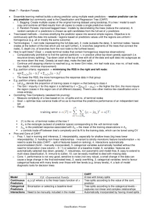 Very concise, consolidated notes from a variety of sources, including lectures, lectorials, tutorials and readings, relating to Actuarial Data Analytic Applications. As someone that also worked at a leading data analytics company for over 3 years, I've incorporated examples from real-world cases to strengthen your comprehension of core concepts. My work experience has always allowed me to decipher the very dense course material and pull and summarise the most relevant information and concepts in a concise way. These notes are designed as effective summaries to reinforce and /or supplement your understanding of the core concepts covered in each week. I found these notes particularly effective in preparation of exams. Ultimately, the notes have been carefully prepared, with certain weeks being summarised in at most 2 pages. They enabled my achievement of a HD. Content: - Week 1: Introduction to Actuarial Data Analytics - Week 2: Data manipulation, assessing data quality and cleansing - Week 3: Communication, modelling and shrinkage techniques - Week 4: Model assessment and selection - Week 5: GLM - Week 7: Random Forests - Week 8: GBM - Week 9: Neural Networks