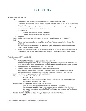 Comprehensive case summaries for Trust topics including: - Intention - Subject - Object - Trusts for charitable purposes - Trusts for non-charitable purposes - Formalities - Complete constitution - Trustee's duties - Personal remedies - Fiduciary duties