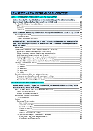 This is a FULL SET of Law in the Global Context notes from trimester 2 2021. I received 87 in this course and was taught by course convenor Jonathan Bonnitcha. These notes also include ALL CASE STUDY NOTES (COVID-19 and Cruise Ships, Assange, Castel Electronics v TCL Air Conditioners and International Child Abduction) that are used in both the mid term assignment and the final exam. CLASS LIST: 1. Introduction: International Law and Globalisation 2. Introduction: International Law and Its Sources 2b. Online – Customary International Law and Freedom and Justice Party Case 3. Introduction: The Relationship between International Law and Australian Law 4. COVID-19 and Cruise Ships: Introducing the Law of the Sea and Navigational Rights LRW 1 (Online) Legal Research and Writing: Introduction and Treaties 5. COVID-19 and Cruise Ships: International organisations, the IMO and the WHO LRW 2 (Online) Legal Research and Writing: Custom and Cases 6. COVID-19 and Cruise Ships: International Dispute Settlement and National Court Actions 7. LRW 3 – Legal Research and Writing 8. Assange: Introduction to Comparative Law and to Extradition 9. Assange: Possible Extradition to Sweden 9b. Online – Assange at the Ecuadorian Embassy 10. Assange: Possible Extradition to US and Diplomatic Protection 11a. Online: Introduction to Private International Law 11. Castel Electronics v TCL Air Conditioners: Introduction to Castel Electronics v TCL Air Conditioner and CISG 12. Castel Electronics v TCL Air Conditioners: Arbitration – Law, Policy and International Dimensions 13. Castel Electronics v TCL Air Conditioners: Enforcement of Arbitral Awards in Australia and Abroad 14. International Child Abduction: the Hague Convention 14b. Online: Implementation of Hague Convention in Australia 15. International Child Abduction: Vincenti/Garning/Garrett Case 16. International Child Abduction: Interaction of Treaty Regimes 17. Revision Class