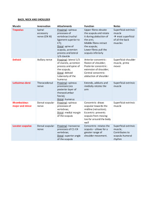 Includes tables summarising all muscles covered in ANAT30007 Human Locomotor Systems - Topics include: muscles of the back, neck and shoulder, upper limbs and lower limbs - In each section tables list the muscle name, its innervation, proximal and distal attachments, functions, and any extra notes describing its role with other muscles, location etc.