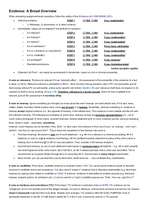 Ultimate Evidence Cheat Sheet I created this summary to make answering assignment and exam questions much, much easier - in a logical format that flows in line with the Evidence Act. All you have to do it go through each element, check against the listed statute and you're away. Just enough case law to get you started too. Plus: a high level summary on p. 1 of all of the main gotchas when it comes to evidence. I tried to make it something that I wish I could have had when I started studying. Set to the lowest price allowed on the website. Feedback welcome! Topics covered: - Adducing evidence - Relevance - Hearsay evidence - Opinion evidence - Admissions evidence - Tendency and coincidence evidence - Credibility evidence - Privilege - Discretions and exclusions
