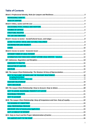 comprehensive notes! - Week 3: Professional Identity, Roles for Lawyers and Resilience - Week 4: Ethics, Justice and the Law - Week 5: Access to Justice - Social/Cultural Issues, and Judges - Week 6: Access to Justice - Economic Issues - W7: Admission, Regulation and Discipline - W8: The Lawyer-Client Relationship: The Retainer & Duty of - W9: The Lawyer-Client Relationship: Duty to Account. Duty to - W10: The Lawyer-Client Relationship: Duty of Competence and - W11: Duty to Court and the Proper Administration of Justice. - W12: The Lawyer’s Duty Colleagues and Third Parties.