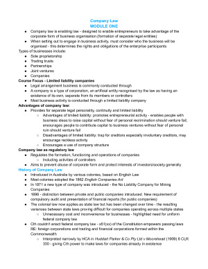 These notes were created from the module documents for the following modules. Module One - Introduction and Background Module Two - The Corporate Constitution Module Three - Corporate Governance Module Four - Members’ Remedies Module Five- Corporate Finance Module Six - Fund-raising Module Seven – Meetings Module Eight – Corporate Insolvency *please note these notes cover off on all the basic principles and include the titles of relevant cases but not case summaries for all of them. For the exam I used only these notes and ended up with a 7.
