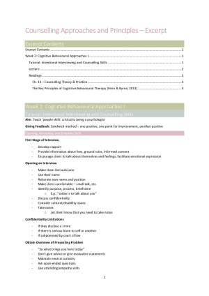 Thank you for viewing my notes! I really enjoyed this unit's content and learnt a lot of really useful counselling skills/theoretical foundations for various psychological therapies. I hope you get a lot out of it too :) These notes include my notes on the lecture content, tutorial content, and notes I made from the key points within the readings. I am a top performing student (within the top 1% of my cohort) and have a WAM of 90, so I trust these notes will serve you well! Here is the full list of what's included*: Week 1: Introduction - Lecture Week 2: Cognitive Behavioural Approaches I - Tutorial, lecture, 2x readings Week 3: Cognitive Behavioural Approaches II - Tutorial, 2x lectures, 2x readings Week 4: Cognitive Behavioural Approaches III - Tutorial, lecture, reading Week 5: Diversity and Resilience in Counselling - Tutorial, lecture, video recording, 2x readings Week 6: Mindfulness and Acceptance Approaches I - Tutorial, lecture Week 7: Mindfulness and Acceptance Approaches II - Tutorial, lecture, reading Week 8: Acceptance and Emotion Focussed Approaches - Lecture, reading ~No content delivered during week 9~ Week 10: Ethical and Professional Practice - Lecture, reading Week 11: Solution-Focused Therapy - Lecture, reading Week 12: Revision - Lecture *Note that there were no tutorials run from week 8 onwards
