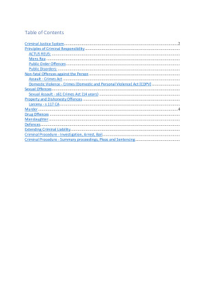 Summary of all 13 Weeks content. Topics: Criminal Justice System Principles of Criminal Responsibility Non-fatal Offences Sexual Offences Property and Dishonesty Offences Murder Drug Offences Manslaughter Defences Extyending Criminal Liability Criminal Procedure - Investigation, arrest etc Criminal Procedure - Summary proceedings