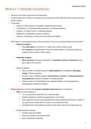 Complete and comprehensive notes for BCMB30002: Functional Genomics and Bioinformatics. I compiled these notes throughout the semester from the lecture videos and workshops. Bullet point formatted with key concepts in bold and colour used to aid revision. I used only these notes to study and got a final 87 in the subject. Contents: Module 1: Genome sequencing Module 2: Bioinformatics Module 3: Genomics and disease Module 4: Gene manipulation Module 5: Chromosome structure and replication Module 6: Coding and non-coding RNAs Module 7: Transcriptional regulation Module 8: Protein networks Module 9: Carcinogenesis Module 10: Tumour suppression Good luck!