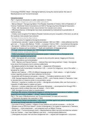 These notes contain all of the topics in ATS2553 and contain material from every lecture, reading, tutorial and optional video. After creating this study guide I was able to receive a 95% average on the quizzes and a HD on one of the major essays. Week 1: Aboriginal testimony during the colonial period: the case of Maulboyheenner and Tunnerminnerwait Week 2: Indigenous justice and settler colonialism Week 3: Language in evidence Week 4: Indigenous language interpreting in legal contexts Week 5: Policing and Indigenous justice- historical relations Week 7: Therapeutic jurisprudence, restorative justice and the Koori court Week 9: Indigenous women in the legal system Week 10: Aboriginal justice agreements and youth justice Week 11: Policing and justice in a contemporary context NB: this study guide doesn't contain content from weeks 6, 8 and 12 as these were independent study weeks where no new content was taught.