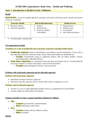 Comprehensive and detailed notes that incorporates all lecture and tutorial content. These notes are colour coded based on which topic it falls under and will be all you need to successfully pass your exam! Topics covered (all lectures is covered and definitions/terms are provided): Module 1: Introduction to Health in Early Childhood - Introduction to Health in Early Childhood - Concepts of Health & Variations of Typical Module 2: Physical Health and Nutrition - Sustainability in Early Childhood Settings - Water Safety - Infection Control - Allergies - PDHPE & EYLF - Indigenous Health - Managing Risk in Outdoor Play - Illness and Immunisation - Physical Activity - Maltreatment - Indigenous Health - Road Safety - Bullying - Nutrition and Food Handling & Storage Module 3: Mental Health and Wellbeing - Sleep - Social and Emotional Learning - Breastfeeding - Body Image - Wellbeing - Mental Health