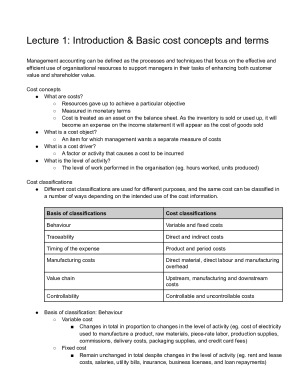 - A detailed notes document of all the topics from Week 1 to Week 12 (No new content for Week 13 and Week 7 is Excel lecture) - Notes cover all content required for quizzes, homework questions and final exam Topics covered: - Introduction & Basic cost concepts and terms - Cost volume profit analysis - Product Costing Systems: Job Costing - Product costing systems: Process costing - Overhead costs - Activity-Based Costing - Absorption and variable costing (Service costing) - Information for decisions - Product mix decisions - Budgeting - Standard costing for control