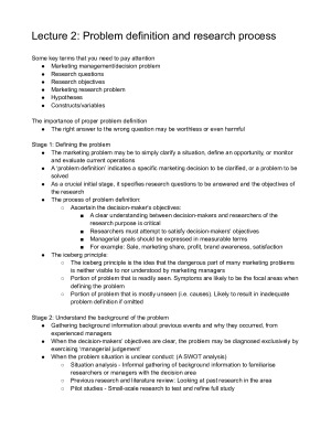 - A detailed notes document of all the topics from Week 1 to Week 12 (No new content for Week 13). - Notes cover all content required for essay writing, weekly quizzes and weekly in-class activity. - This document summarises all the important concepts in this unit and has a few diagrams to help explain the difficult concepts. Topics Covered: - Introduction to Marketing Research - Problem definition and research process - Qualitative Research I - Qualitative Research II - Constructs, measurements and scales - Questionnaire Design - Surveys, experiments and observations - Planning the sample and preparing the data - Data analysis 1 - Univariate analysis - Data analysis 2 - Test of differences - Data analysis 3 - Test of association - Multivariate Analysis and Communication of results