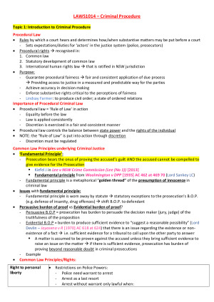 Excellent summary notes for Criminal Procedure and Civil Procedure - covers the entire CCP course. Topics Introduction to Criminal Procedure Police Powers and Discretion Bail Pre-Trial Processes and Appeals Sentencing Civil Process, Open Justice, Fairness, Adversarial System Matters Preceding Litigation and Commencing Proceedings Pleading and Particulars + Discovery to gather evidence Opposing Disclosure: Objecting to Production & Privilege Class Actions and Trial Issues