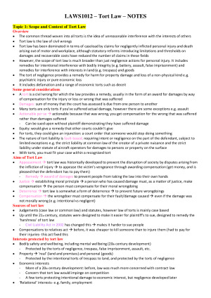 Excellent summary notes for Torts Topics: Scope and Context of Tort Law Historical Background Trespass to the Person Action on the Case for Wilful Injury The Statutory Action for Psychiatric Injury to Relatives of Victims of Intentional Wrong Damages for Intentional Torts to the Person Defences to Intentional Torts Negligence Negligence: Breach of Duty Causation and Remoteness of Damage/Scope of Liability Defences to Negligence