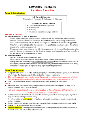 Excellent concise summary notes for the final exam Topics: Introduction Agreement Certainty Consideration Intention to create Legal Relations and Formalities Estoppel Terms Construction Exclusion Clauses and Privity Discharge by Performance and by Acceptance Discharge for Breach and Repudiation Process and Effect of Termination and Discharge by Frustration