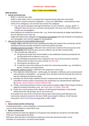 Excellent, detailed notes - including from seminars, problem solving tutorials and Readings (Brown Textbook (2020)) Topics Crime, Law and Morality Scope and Principles of Criminal Law Elements of Criminal Offences I Elements of Criminal Offences II Homicide I: Murder Homicide II: Unlawful and Dangerous Act Manslaughter Assault, wounding and GBH offences Assault, wounding and GBH offences/Sexual Offences Sexual Offences Larceny Extending Criminal Liability: Complicity Extreme Provocation Self-defence and Excessive self-defence Duress and Necessity Mental Health Impairment or Cognitive Impairment and Substantial impairment because of Mental Health Impairment or Cognitive Impairment Automatism Use of Evidence of (i) mental illness or (ii) self-induced intoxication to negate intent