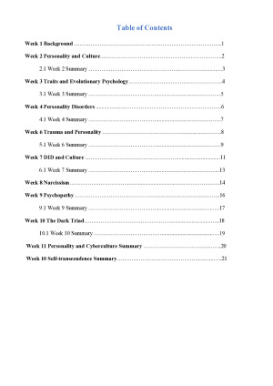 Hey! These notes contain both dot-pointed subject notes as well as written summaries for most weeks that provide important critical evaluations of ideas. I received a HD in this unit with an overall mark of 88. The table of contents for these notes is as follows: Week 1 Background Week 2 Personality and Culture Week 2 Summary Week 3 Traits and Evolutionary Psychology Week 3 Summary Week 4 Personality Disorders Week 4 Summary Week 6 Trauma and Personality Week 6 Summary Week 7 DID and Culture Week 7 Summary Week 8 Narcissism Week 9 Psychopathy Week 9 Summary Week 10 The Dark Triad Week 10 Summary Week 11 Personality and Cyberculture Summary Week 12 Self-transcendence Summary